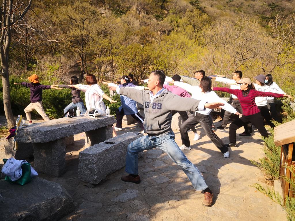 在爬山途中,大家相互搀扶、互相鼓励,不时合影留念,欢声笑语伴着溪流越来越远。在休息时刻,刘景泰教授带领大家练习瑜伽,大家感到心情愉悦,身心得到放松,陶冶了情操。