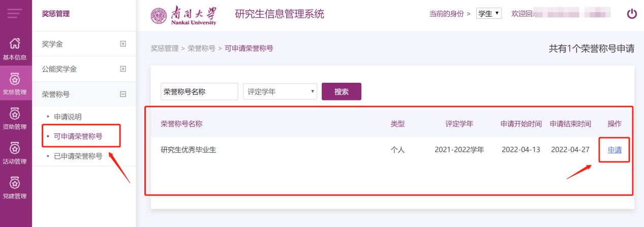 员工可在研究生信息管理系统奖惩管理模块下的荣誉称号菜单点击选择研究生优秀毕业生进行申请,填写信息并提交后可下载打印个人申请表用于后续考评环节。