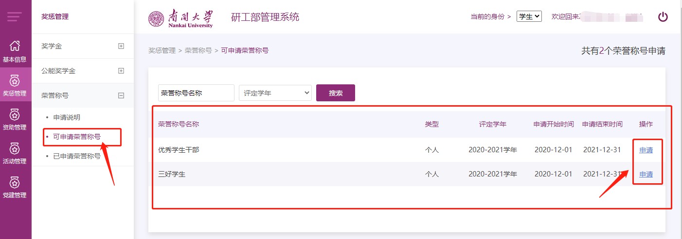 本年度荣誉称号和奖学金申请流程相互独立,员工不需要提交个人信息也可以申请荣誉称号。员工在奖惩管理模块下的荣誉称号菜单,可点击选择可申请的荣誉称号,选择相应的荣誉称号进行填写提交,提交后可下载打印个人申请表。