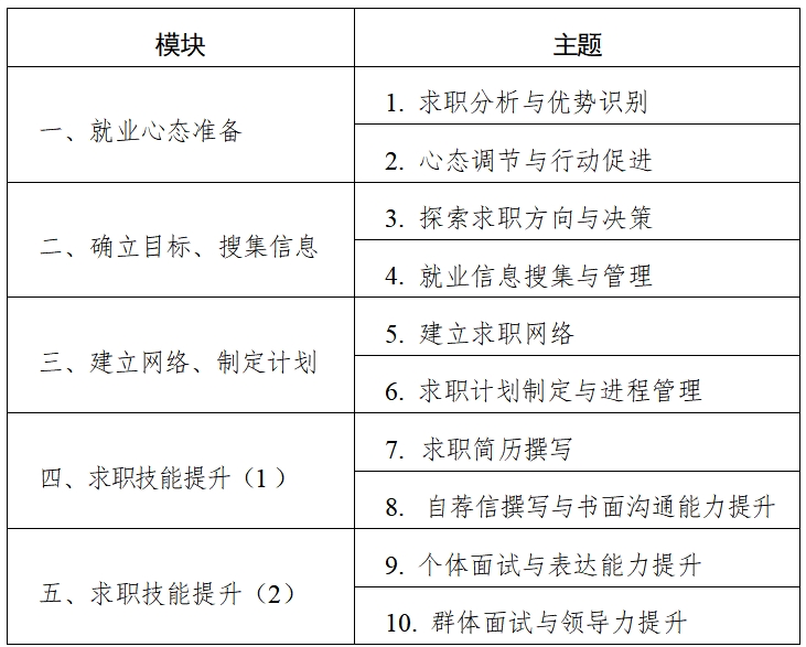 培训包含5个模块、10个主题,每个主题4课时(半天)。培训总时长为5天40课时。每个模块均包含基础知识、能力训练和态度改变三个部分,其中理论讲授和能力训练部分各占50%,注重引导员工在互动中探索职业方向、提升就业能力。
