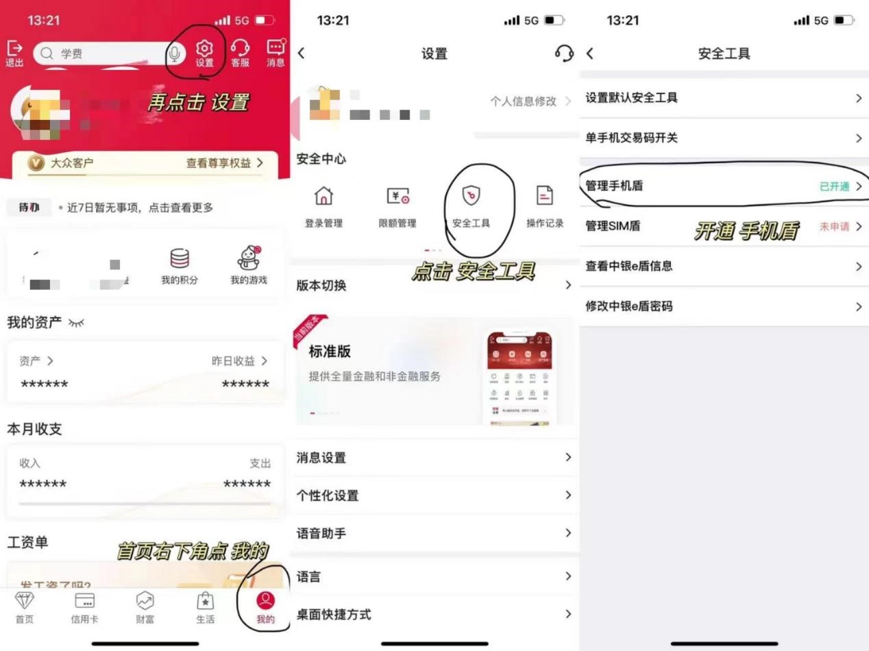 特别提醒:线上提前还款前提条件需要开通手机盾具体流程如下