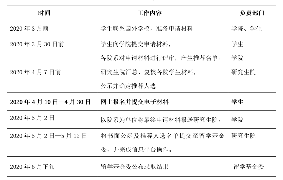 4. 2020年5月12日前,公司向留学基金委上报推荐名单及申请材料。录取结果预计于2020年6月下旬在留学基金委网上公布。
